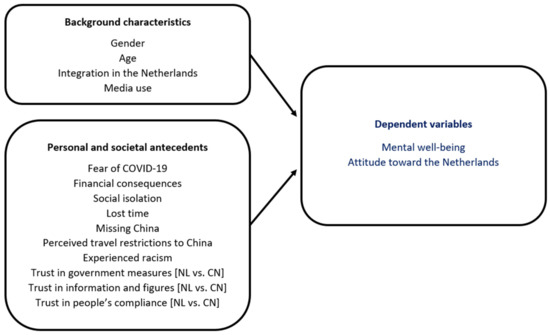 To investigate Chinese immigrants’ perceptions of and experiences with the COVID-19 pandemic, we conducted an online survey during the second wave of the pandemic (November–December 2020) among Chinese immigrants living in the Netherlands. Our research question was: What are the personal and societal antecedents of the mental well-being of Chinese immigrants living in the Netherlands during the COVID-19 pandemic? We focused on two dependent variables: (1) Chinese immigrants’ perceived decrease of mental well-being (the perceived change in position on the continuum between depression and happiness since the start of COVID-19), and (2) their attitude toward the Netherlands (the perceived change in their personal relation with their host country since the start of COVID-19).