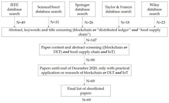 In Stage 1 of the SLR, the target research topic was identified, defining applications of DLT and IoT in FSCs domain. At this stage, a research protocol was developed, and search keywords were selected. Search queries were performed in five databases: IEEE Xplore Digital Library, ScienceDirect, Springer Link, Taylor and Francis Online, and Wiley Online Library. The combination of the following keywords was used in the search: “blockchain” OR “distributed ledger” AND “food supply chain”. In the search, no duplicates were detected. The details of the research protocol are summarized in Table 1. Based on the keywords and selection criteria used, publications made available online until (and including) December 2020 were selected in the process.