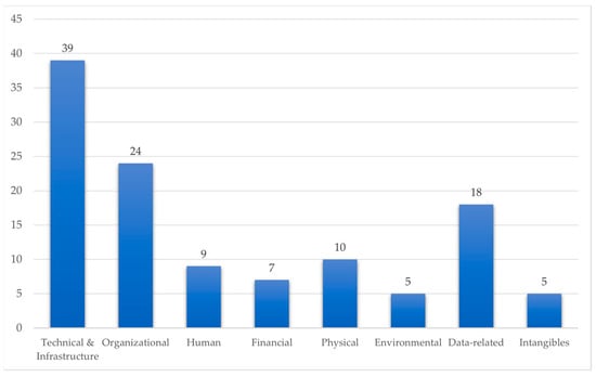 The content analysis of shortlisted papers was carried out, identifying 196 keywords of challenges, which were mentioned or addressed in the selected literature. The identified challenges were manually classified into the following thematic clusters: technical and infrastructure, organizational, human, financial, physical, environmental, data-related, and intangibles. The clusters were adapted from [12] classification of supply chain resources, with two additional added categories: environmental and data-related.
