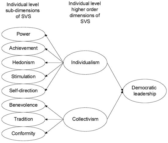 We can sum up that the literature offers a plethora of studies where personal values are linked with the sustainable working and behavior of leaders, as well as studies linking leaders’ behaviors and sustainability [,,,,]. Despite the considerable number of studies, in light of the crossing silos in leadership research, there are less studies available that discuss how personal values, via democratic leadership behavior, can contribute to sustainable organizational working and behavior. More precisely, in this manuscript we focus on the commonly used autocratic–democratic leadership continuum, while considering personal values through the lenses of individualistic values (IVs) and collectivistic values (CVs), as defined in Schwartz value theory []. With this study, we aim to analyze how personal values, via democratic leadership behavior, can contribute to more sustainable organizational working and behavior from areas with different institutional, economic, and cultural backgrounds.