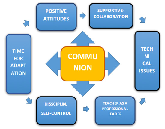Figure 1 demonstrates the whole picture of the categories and their hierarchical dependence. Firstly, the need for time for adaptation was identified. After the adaptation period, the categories of positive attitudes, supportive collaboration, discipline, and self-control, the need for professional leadership supportive collaboration was defined. All the categories were united by communion, which was identified as a strongly pronounced dimension during the crisis. The category of technical issues is the last in the row. All the previous categories have help (or could have helped) solve the technical issues. The analysis of links among categories showed that after the transition to online learning during the pandemic, the dimension of communion and supportive collaboration acquired significance among actors in education. The categories distinguished in the responses of research participants were observed at all the levels of education and ensured the successful activities of actors in the education process in distance learning. The informants’ interviews highlighted the significance of communication and communion at the beginning of a crisis. There emerged a need for communion and mobilization for joint activities in the critical situation when performing new activities, even in the individualistic Western society. The necessity for providing help and care appeared, and the possibility of coping more easily with difficulties together was pointed out. Human relations became of paramount importance. A preliminary qualitative inquiry of Japanese students in the early stage of the pandemic revealed that social connection is critical for creating and enhancing learning opportunities [1]. This was in line with the ideas of Smoyer et al. [18], who emphasize the importance of social connection, particularly in the context of emergency teaching. The majority of scientific studies provide for the relevance of the teacher and the relation with them in the technology-mediated process of learning [47,48,49]. In the crisis, relations gain even more considerable importance [18], and the need for all the learning process’ parties, including the children’s parents, emerges. Gigliotti [4] claims that “incidents and emergencies happen, but crises are created through communication—and it is through communication that they must be addressed”. Schut et al. [50] found that high levels of teacher communion positively impacted the perception of learning assessment, particularly in relations in which teachers’ agency was less dominantly exercised. Findings from a study by Smoyer et al. [18] showed that remote learning shapes the interpersonal relationships and communication critical to building students’ sense of classroom belonging, engagement, and learning. They examined student feedback about educational experiences during the 2020 COVID-19 pandemic and indicated that class structure and instructor communication positively affected the building of community. It allowed students to be seen and known by others. These efforts bolstered their engagement with the class and kept them motivated.