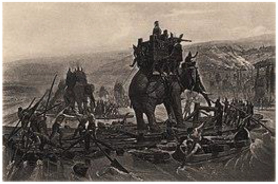 War Elephants Depicted in Hannibal Barca Crossing the Rhone (Jhelum River) [19].