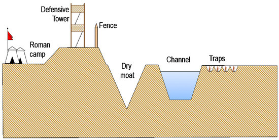 The water also served to hinder the construction of tunnels designed to pass under the walls or make them collapse. One of the systems used was to flood the moats around the fortifications. Even Julius Caesar used this technique in Gaul (J.C., De Bello Gallico, VII, 72) when he arranged to divert a surface stream to fill the moat surrounding the military camp from which he besieged the city of Alesia [24] (Figure 4). The effectiveness of moats against tunnels made by the besiegers was somehow codified by Flavius Vegetius in the fourth century AD (Vegetius, De Re Militari, Liber IV, 5).