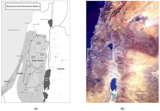 Jordan River basin: (a) shared Israeli–Palestinian waters and (b) a satellite picture [53].