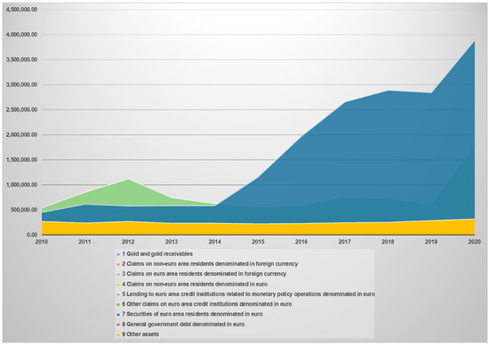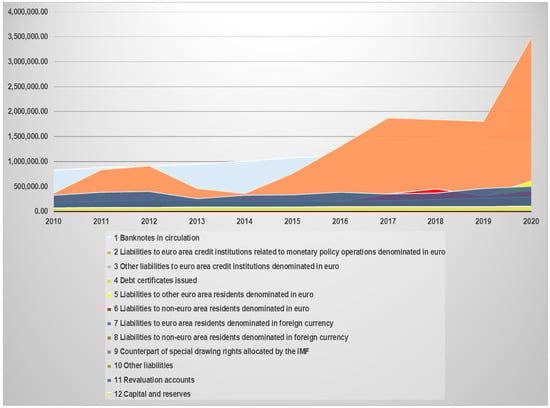 Figure 4 show the composition of the ECB’s balance sheet, separating assets from liabilities. On the assets side, the large growth in government bonds issued by the various euro area governments can be seen. On the liabilities side of the ECB’s balance sheet, bonds to euro area credit institutions and banknotes in circulation stand out. It can be seen that liabilities to financial institutions have increased despite the ECB’s penalties on bank deposits.