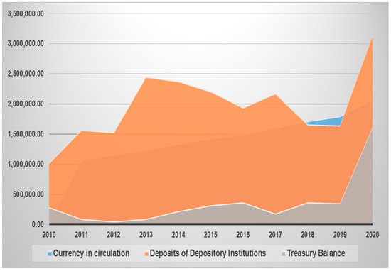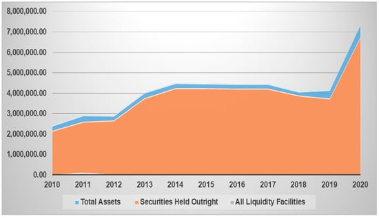 49], a balance sheet reduction starting in 2017 and running through the summer of 2019, and from September 2019, the Fed’s balance sheet expands again, before the COVID-19 crisis. The Fed injected a large amount of liquidity to support banks in the face of a liquidity crisis in the repo market. Repos have repurchased agreements on securities (usually government bonds, treasury bills, bonds, or debentures) that commercial banks enter into to obtain short-term funding. The purchase of securities has been boosted during the pandemic.