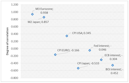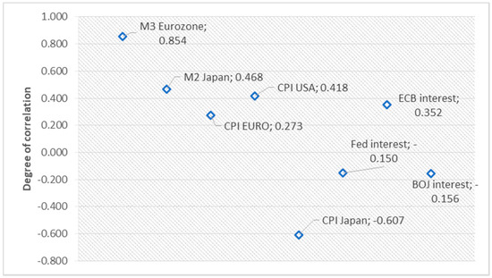 Figure 7 shows a strong positive correlation between M3 in the euro area and the price of Bitcoin. The same is true if we compare M2 in Japan with this cryptocurrency. This positive correlation also occurs concerning the price of gold, as shown in