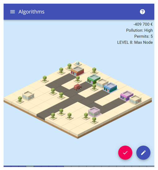 The direct aim of the player in the Eco JSity game is to prevent city pollution in daily activities. The player acts as a commercial advisor who has to solve programming puzzles to build a quarter of the city to start generating income while avoiding excessive pollution, which decreases the game score. The successful implementation of programming-related tasks allows for increasing city revenue and the game score. The selection of programming tasks follows the list of topics for an undergraduate computer science course suggested by the Association for Computing Machinery Computing Curricula [57]. The game is composed of 19 levels of increasing difficulty, each of them focused on a single algorithmic problem to be solved using JavaScript. The covered range of topics includes common computer science problems, such as: linear algorithms, branching (conditional) algorithms, iterative algorithms, search and sorting algorithms, recursion, tree traversal, and graph algorithms.