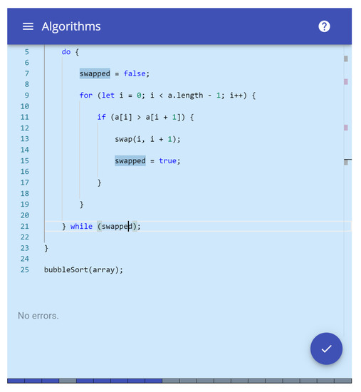 While Eco JSity is obviously rooted in the theory of game-based learning [54], some of its traits are also representative of ubiquitous learning (defined as “an everyday learning environment that is supported by mobile and embedded computers and wireless networks in our everyday life” [55]) and mobile microlearning, which both limits the time required from a student to pass a single unit of learning (a micro-lesson) to a few minutes and emphasizes that the content is specifically prepared to be presented on the small screens of smartphones [56].