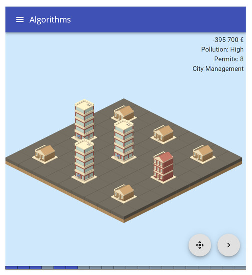What is presented in Figure 1 is the solution visualization view, one of three primary view types available in the Eco JSity app. The second one is the code editor view, where the user can type in the program code solving the current level’s challenge (Figure 2), and the third one is the city planner view (Figure 3), which is the board for the main city-building game played across programming challenges, dedicated only to teaching sustainable development concepts. Its key challenge is to attain a state of reasonable balance between income and pollution, which both increase with the city’s growth. The city-building game is closely connected with solving the programming challenges, as the development opportunities expand with every completed level, and the longer the time taken to solve a challenge, the more pollution is emitted.