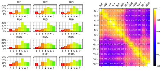 The histograms showing the number of respective answers (remember that a seven-point Likert scale was used) are shown in the left part of Figure 5, whereas the right part shows the correlation between the answers to the respective questions. The analysis of the TAM questionnaire scores allowed noticing a significant advantage of positive indications over negative ones for every measure, the most apparent for PU1, PU5, PU6, and PEU1. For these measures, a large share of maximum indications (seven) was also noted. The most frequently chosen grade for most of the measures was five, except for PU6, where an answer of six predominated, and PEU6 with a similar number of indications of five and seven. The question regarding the respondents’ attitude about the ease of becoming skilled in using the application (PEU5) received the highest number of strong disagreement (one) responses among all questions, though the respective number of strong agreement (seven) answers was still higher.