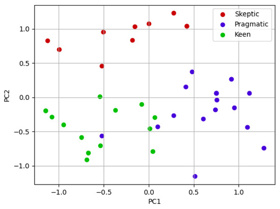 The cluster marked with red dots was labeled skeptic, as only in it, the opinion that adding the topic of sustainable development to the programming course will unnecessarily distract students from its main topic received positive answers (57%). Despite such an assessment of the sustainability element in the game, every second representative of this group believed that sustainable development was a key challenge for governments and researchers, and forty-three percent of them tried to follow the principles of sustainable development in their everyday lives. The cluster marked with blue dots is labeled pragmatic, as all of its members believed that adding the topic of sustainable development would not affect the reception of the course, but would improve the awareness of sustainable development among students; eighty-one percent of the representatives of this group positively assessed sustainability as a game topic. The last cluster, marked with green dots, was labeled keen as 90% of its members believed that sustainable development was a key challenge for governments and researchers, and all of them thought that adding the topic of sustainability would make the programming course more interesting. Note, though, that even among the keen cluster members, only half of them expressed the opinion that the topic of sustainability had not distracted them from learning the algorithms, which was, however, the highest percentage across the three clusters. This result can be interpreted in two ways, that for more than half of the students:
