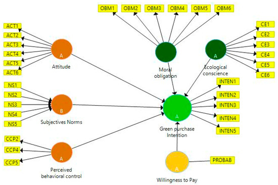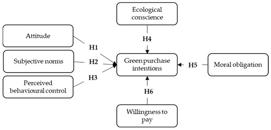The theory of planned behavior [13] has been used to consider certain critical variables within the green marketing literature, which take into account predictors of intention: attitude towards behavior, subjective norms, and perceived behavioral control [29]. Likewise, Giampietri et al. [30] mention that these variables contribute specifically to understanding human behavior. In the context of purchase intention for green products, variables like ecological conscience [31,32,33] and moral obligation [14,32,33] have been recently added to the model proposed by Ajzen [9].