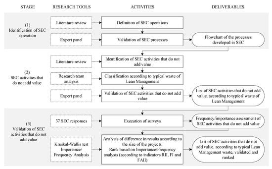 The research methodology is organized into three stages: (1) identification of SEC operation, (2) identification of SEC activities that do not add value and (3) validation of SEC activities that do not add value. Figure 1 specifies the activities, research tools and deliverables for each stage of the research. The research is focused on building projects with private procurement.