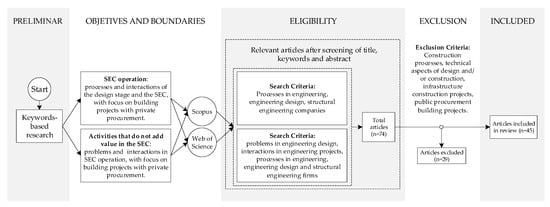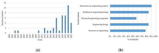 - In (a), to identify the workflow of the SECs, the following search topics were considered: processes in engineering, engineering design and structural engineering companies. Journals specializing in structural engineering, engineering and construction project management and conference proceedings were considered, based on the Web of Science and Scopus collections. Documents focusing on construction processes and technical aspects of design and/or construction were excluded. For the search, documents from the year 2000 to the present were considered.