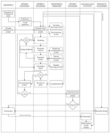 For any particular building project entering an SEC, the workflow begins with the arrival of the architectural plans, which contain the spatial dimensioning of the work and a preliminary structuring given by the architecture. These plans are reviewed by the senior structural engineer (a civil engineer with experience in the area), who indicates modifications to the architectural structuring and proposes, if necessary, a new preliminary structuring (the arrangement of structural elements, such as walls, beams and columns, that must support the weight of the structure itself, as well as the potential services and loads it will experience during its projected useful life) [45]. This marks the beginning of the iterative design process and from here, the project is passed on to one or more civil engineers who are responsible for carrying out structural analysis models, verifying the structuring, doing the preliminary design, proposing solutions for the correct design and, finally, producing a calculation report containing the theory applied and the regulatory criteria adopted [46].