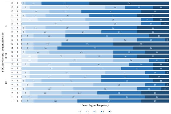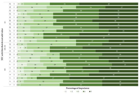 According to lean management, the type of waste with the highest presence in SECs is W2—“Waste of time on hand” (21 SEC activities, 84%), followed by W4—“‘Waste of processing itself” (19 SEC activities, 76%), W3—“Waste in transportation” (18 SEC activities, 72%), W5—“Waste of movement” (17 SEC activities, 68%), W7—“Waste of making defective products” (17 SEC activities, 68%) and W8—“Unused Employee Creativity” (16 SEC activities, 64%). Two additional categories had a much lower presence, namely W1—“Waste of overproduction” (six SEC activities, 24%) and W6—“Waste of stock on hand” (four SEC activities, 16%).