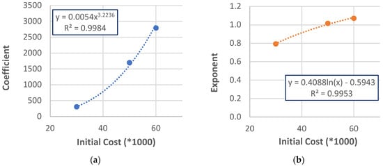 Coefficients (306.1, 1696.4, and 2789.7) and exponents (0.793, 1.016, and 1.071) of these equations are drawn with initial cost as an independent variable and the plotted graphs are shown in Figure 2a,b. For the current study, the initial cost values were taken from the earlier study [], which were collected from individual building’s developer. From the best-fit lines of these graphs, it is found that the coefficients follow a power-function pattern with initial cost, whereas the exponents follow a logarithmic pattern with initial cost. The best-fit equations are as follows: