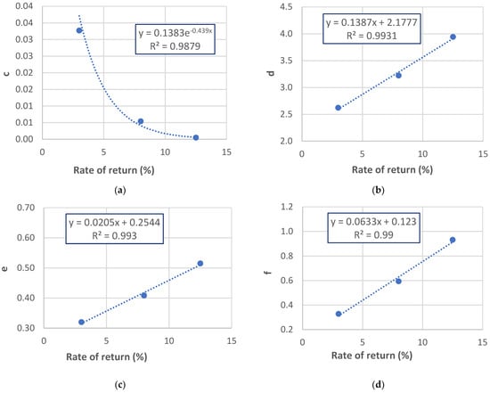 Equations (3)–(7) are based on a particular value of rate of return. Similar sets of equations can be derived for different values of rate of return. As for example, for three values of the rate of return, each of the above-mentioned parameters (c, d, e, and f) will have three different values, i.e., c ⇒ {c1, c2, c3}, d ⇒ {d1, d2, d3}, e ⇒ {e1, e2, e3} and f ⇒ {f1, f2, f3}. It is found that the sets of “c”, “d”, “e” and “f” can be expressed as per following equations: