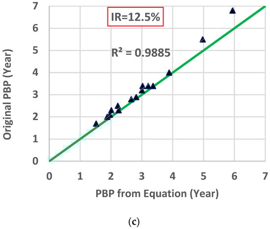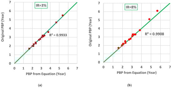 The following section derives each of the above-mentioned parameters based on the calculated results of the payback periods (PBP) from the study of Karim et al. [] and subsequent analysis. All the mentioned parameters were derived from the best-fit equations, which were plotted against interrelated parameters. Finally, the results calculated through the derived equation were compared with the original calculated PBPs. Payback periods were calculated for three internal rates of return (3%, 8%, and 12.5%), and for three initial costs (30 K, 50 K, and 60 K) and five roof sizes (315, 452, 532, 562, and 727 m2).