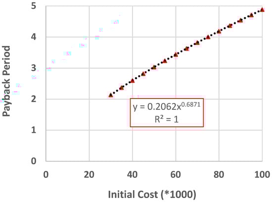 Figure 1 clearly demonstrates the relationship of roof area with the payback period, which is following a power function with a negative exponent value and the final developed equation contains the same function. However, from the developed equation it is difficult to visualise the relationship of initial cost with the payback period, as the initial cost is embedded both in the coefficient and exponent of the base equation i.e., Equation (12). To visualise the relationship between initial cost and payback period, the developed equation was used to calculate a series of payback periods (PBPs) for different values of the initial cost ranging from 30 K to 100 K for a fixed roof area of 500 m2 with an 8% rate of return. Figure 5 shows the relationship between initial costs and equation estimated payback periods. From the figure it is clear that it follows a clear pattern; a regression line produced with the calculated points provided a power function (with an exponent less than 1.0) as a best-fit line having a coefficient of determination (R2) value of 1.0.