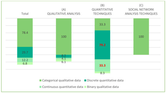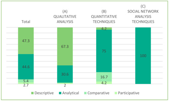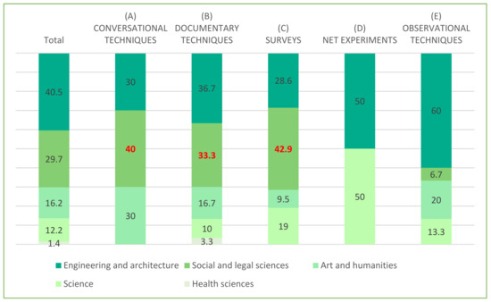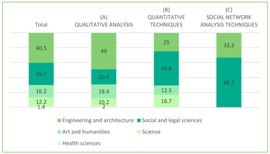 There were various collection techniques with samples from 201 to 500 (5.4%). First, there were documentary techniques, review of courses and PhDs on biomass, bioenergy and biofuel [28], and official documents [92]. Second, and to the same degree, there were collection techniques by survey and conversations aimed at students [29] and subjects who participated in discourse on social networks [59].