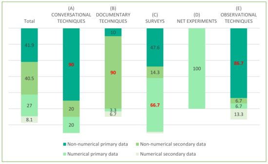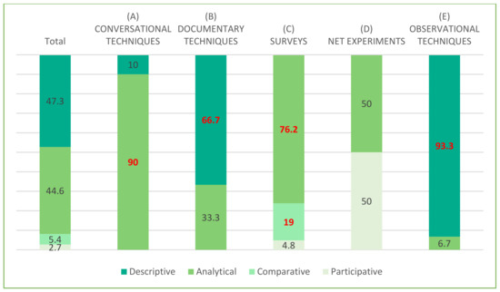 As an information collection technique (primary and secondary), the research used documentary techniques (40.5%), surveys (28.4%), observational techniques (20.3%), conversational techniques (13.5%) and experimental techniques (2.7%). In Figure 3 the distribution of the information collection techniques of the research is shown.