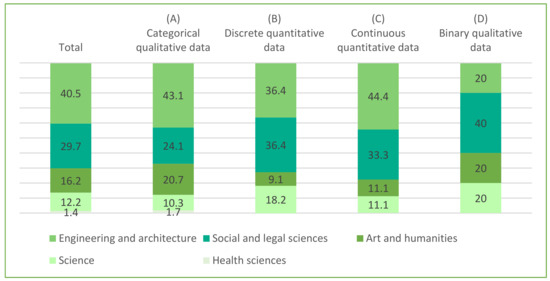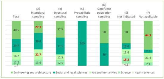 Samples of 1 to 50 (27%) participated in research collected by surveys mainly made up of students from different educational levels: basic school level [88], high school [14], undergraduate [62] and postgraduate [61]. There were also samples made up of active professionals [34,65,83], representatives [52] and experts [13,66]. Notable within this interval were samples collected through conversational techniques. These samples were made up of a broadly professional profile referring to policy makers [82], stakeholders [85], agents of educational institutions [18] and experts [89] and academic scientists and representatives of the economic and industrial sector [81]. Finally, the documentary techniques which used samples from 1 to 50 were made up of scientific literature and publications [21,87], websites [90] and academic work [84].