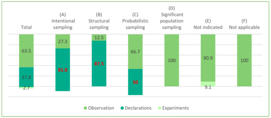 The majority of samples with over 2000 participants (14.9%) used documentary collection techniques. Thus, information was collected from scientific literature on CE and Internet of Things (IoT) [59], life cycle analysis for bioenergy [60] and green marketing and industry [93,94,95]. The surveys which used these samples focussed on the business sector, aimed at collecting data from European SMEs [63,64]. Finally, there were observational techniques which collected information from SMEs and European firms [73] and educational courses on product development [96].