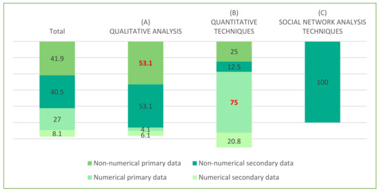 The studies that used secondary information gathering techniques were a minority and used conversational methods (4.1%) either through open interviews (1.4%), semistructured interviews (1.4%) or focus groups (1.4%). This research was characterised by using more than one information gathering technique. Although none of these used observational techniques, they are notable for focusing on the education sector, specifically on the area of higher education for developing learning programmes and courses on the topic of CE [83,84] and the implementation of strategies based on CE in the academic environment [85]. There was also research focused on understanding [86] and the provision of innovative solutions [87] for SMEs when applying CE in their business models.