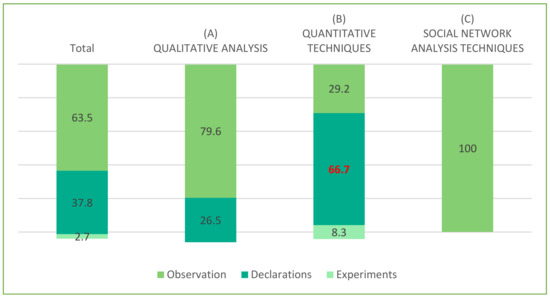 In turn, the majority of information gathering used a single technique (93.2%) compared with research that used two or more (6.8%). Notable among the primary techniques used were documentary techniques (39.2%), through content analysis (32.4%), discourse analysis, (2.7%) documentary analysis (2.7%) and others (1.4%). Next were surveys (27%) using attitude surveys (6.8%), opinion surveys (16.2%) and others (4.1%). Used also were observational techniques (20.3%), using self-observation (17.6%), systematic observation (1.4%) and participant observation (1.4%). Fourth were conversational techniques (10.8%), using Delphi (2.7%), open interviews (1.4%), semistructured interviews (2.7%), focus groups (2.7%) and discussions on social networks (1.4%). Finally, in the minority, was research that used experimental collection techniques (2.7%) through undertaking field experiments (1.4%) and group experiments (1.4%).