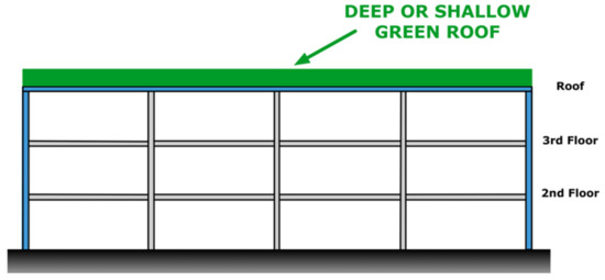 Green roofs, also known as living roofs, vegetated roofs, eco-roofs, and roof gardens, are all roofs covered in vegetation ranging from grass to park-like environments with full-sized trees and plants. These roofs do not have potted plants but rather an engineered substrate attached to the structural system which may include filter fabrics, foam insulations, root barriers, a waterproofing membrane, and structural decking [6]. These roofs can be categorized based on the soil substrate’s depth: shallow or deep. Shallow roofs are characterized by lower weight (2.8 kPa) and 5–30.5 cm of soil substrate with vegetation such as grass, sod, or ground cover [7]. In contrast, deep roofs are characterized by higher weight (7.2 + kPa) and over 61 cm of soil substrate with larger vegetation such as full-sized plants, bushes/shrubbery, and even trees [7].