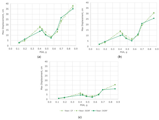 Maximum floor displacements at (a) roof, (b) 3rd floor, and (c) 2nd floor in the near-field.