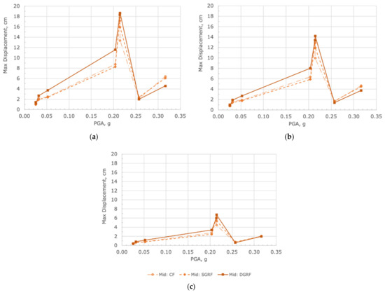 Figure 4 presents the results in the FF region. Again, there are some very clear trends here to discuss. For events with a PGA below 0.07 g, the response is quite consistent between the CF, SGRF, and DGRF with no significant increases/decreases in the max displacements. At the 0.07 g mark and above, the DGRF stands out as having the ability to decrease the maximum response by nearly 40% at the roof level and almost by half (46% and 48%) at the 3rd and 2nd floors, respectively. These trends again have similarities to the NF and MF regions with a single PGA point of trend change, a region of negligible impact, SGRF showing comparable results to the CF, and most importantly a consistent response through the structure’s height.