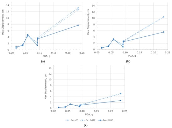 Maximum floor displacements at (a) roof, (b) 3rd floor, and (c) 2nd floor in the far-field.