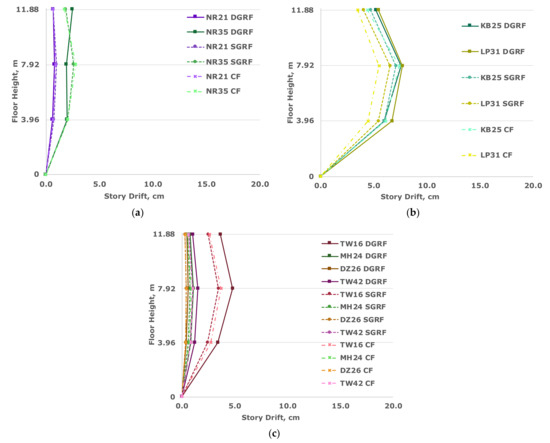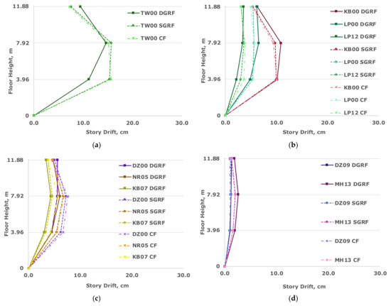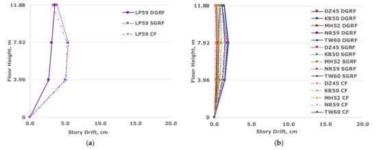 Through the floor displacements alone, the DGRF stands out from the other scenarios as it presents opportunities for response improvement under certain conditions. However, this improvement needs to consider the impacts on other responses such as those discussed in the following discussion. Additionally, within a given region, there is a clear dependence on PGA defining which trend will be most probable for the given structure.