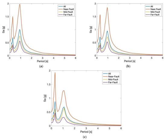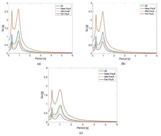 Median roof floor response spectra for all roof scenarios grouped based on distance from fault: (a) Near-field, (b) Mid-field, and (c) Far-field.