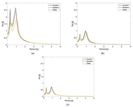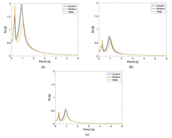 Median roof floor response spectra for all distances from fault grouped based on roof scenario: (a) Control, (b) Shallow, and (c) Deep.