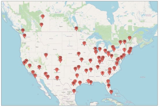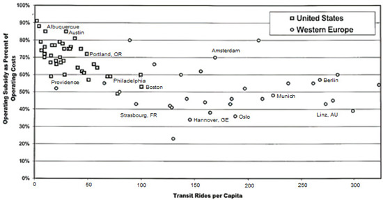 A discrepancy in dependency on transit systems between the US and European cities has been widen. For example, Freemark [31] in his comparison analysis with data of 2002–2018 period reported that the transit ridership in the U.S. urban cities had declined by 15% during 2010–2018 while that in the French counterparts had increased by 18% during same period of time. With a few exceptions such as New York, Boston, and Houston, people in the U.S. cities tend to prefer using their own cars instead of using public transit system. Freemark [31] attributes the transit’s decline in the U.S. to some factors such as low gas price, cultural influences, and economic differences from European ones. On the contrary, the largest French cities had developed effective tram and bus services. Public transit systems in French cities were designed to serve large and dense cities and a large amount of resources has been invested to develop pedestrian-friendly facilities. As an additional evidence, Figure 1 shows that there is a clear demarcation between US and Western European cities in terms of transit ridership per capita [32].