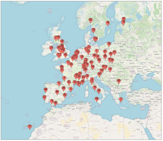 90 Cities in Europe. 1. Amsterdam(T108) 2. Antwerp(T41) 3. Athens(T18) 4. Barcelona(T36) 5. Berlin(T49) 6. Bilbao(T140) 7. Birmingham(T78) 8. Bologna(T93) 9. Bordeaux(T36) 10. Bratislava(T84) 11. Bremen(T100) 12. Bristol(T25) 13. Brussels(T14) 14. Budapest(T108) 15. Cardiff(T68) 16. Cologne(T25) 17. Copenhagen(T100) 18. Dresden(T78) 19. Dublin(T4) 20. Edinburgh(T7) 21. Florence(T78) 22. Frankfurt(T58) 23. Freiburg(T100) 24. Gdansk(T49) 25. Geneva(T20) 26. Ghent(T128) 27. Glasgow(T49) 28. Gothenburg(T100) 29. Graz(T49) 30. Grenoble(T58) 31. Hamburg(T30) 32. Hanover(T49) 33. Helsinki(T140) 34. Karlsuhe(T84) 35. Katowice(T135) 36. Krakow(T14) 37. Las Palmas(T68) 38. Leeds(T78) 39. Leicester(T33) 40. Leipzig(T93) 41. Lille(T108) 42. Lisbon(T20) 43. Liverpool(T41) 44. Ljublijana(T140) 45. Lodz(2) 46. London(T7) 47. Lyon(T49) 48. Madrid(T84) 49. Malaga(T108) 50. Malmo(T128) 51. Manchester(T14) 52. Mannheim(T93) 53. Marseille(T7) 54. Milan(T41) 55. Montpellier(T36) 56. Munich(T41) 57. Nantes(T84) 58. Naples(T30) 59. Newcastle(T33) 60. Nice(T49) 61. Nottingham(T68) 62. Nuremberg(T41) 63. Oslo(T41) 64. Palermo(T4) 65. Paris(T14) 66. Porto(T68) 67. Poznan(T25) 68. Prague(T58) 69. Rennes(T68) 70. Rome(T7) 71. Rotterdam(T123) 72. Rouen(T113) 73. Saint-Etienne(T115) 74. Seville(84) 75. Sheffield(T22) 76. Stockholm(T58) 77. Strasbourg(T58) 78. Stuttgart(T25) 79. Tallinn(T33) 80. Thessalonica(T84) 81. Toulon(T58) 82. Toulouse(T58) 83. Turin(T84) 84. Utrecht(T128) 85. Valencia(T100) 86. Vienna(T36) 87. Warsaw(T18) 88. Wroclaw(T22) 89. Zaragoza(T115) 90. Zurich(T36).