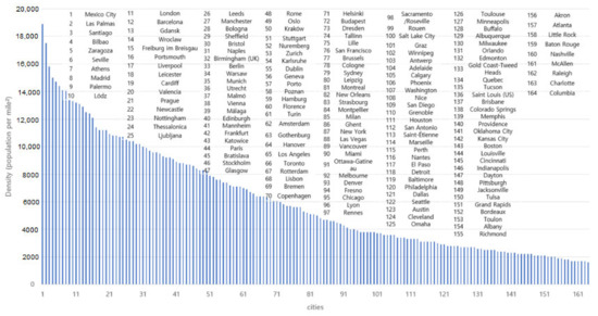 The 164 cities were then further divided into two groups: (1) 66 U.S.-Canadian cities and (2) 98 cities in 14 mostly European countries including Germany, United Kingdom, France, Spain, Poland, Australia, Italy, Netherlands, Belgium, Norway, Switzerland, Ireland, and Mexico. The population density of 66 cities was estimated at 3139 persons per square mile, while the density of 98 cities was higher at 8169 persons, as shown in Appendix A Table A1.