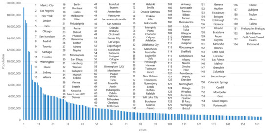 For data, the TomTom traffic index was downloaded from [9]. The 2016 TomTom traffic index covered 390 cities in 48 countries. For multivariate analysis, GDP per city as well as GDP per capita per city for 280 cities in the world for 2010 were downloaded from the World Cities Report 2016 by UNHABITAT: http://wcr.unhabitat.org/ (accessed on 20 December 2020). By dividing GDP per city by GDP per capita per city, we obtained population figures for 2010. Population density data were downloaded from the “Demographia World Urban Areas and Population Projections 10th Annual Edition 6.1: 2010.7” at http://www.demographia.com/db-worldua2010.pdf (accessed on 20 December 2020).