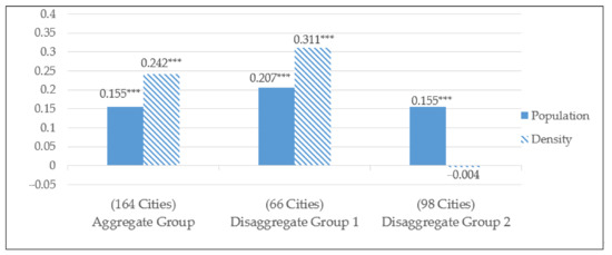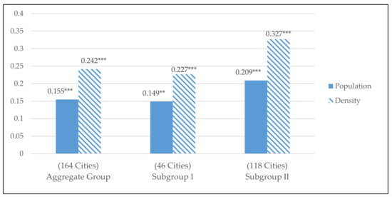 Fifth, as for the difference of impact among the three variables, the large population subgroup of 46 cities displayed the order of impact from income at −0.349, followed by density at +0.227 and population at 0.149. The smaller population subgroup of 118 cities displayed the order of impact from density at +0.327 followed by population at +0.209.