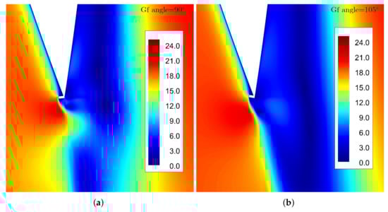 Figure 14a,b show the normal and tangential force coefficients acting on the turbine blade for the Gurney flap configuration of at two flap angles and . The considered tip speed ratio is . This is where the turbine is near the optimal position for the baseline case. It can be seen that the normal and tangential force coefficients increase starting from the azimuth angle of until the azimuth angle of . These forces then decrease steadily, reaching zero at about . The normal force then becomes negative as the angle of attack is also negative within the downwind region. A different characteristic is observed for the tangential force. It is shown that, for an azimuth angle larger than 180, the tangential force in general remains constant around the zero level. This shows that the (negative) lift generated within the downwind phase has only a small contribution to the tangential force component.
