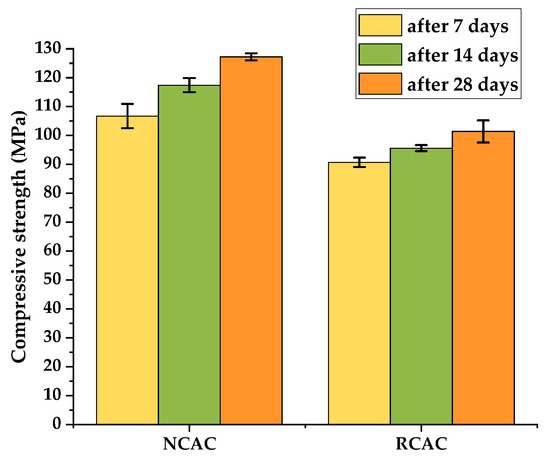 Despite the lower mechanical properties of RCAC compared to the high-strength concretes with high strength, made of NCA, the concretes with recycled aggregate were characterized by greater compressive strength values, reaching approximately 100 MPa. Thus, higher strength parameters can be achieved by increasing the designed compressive strength.