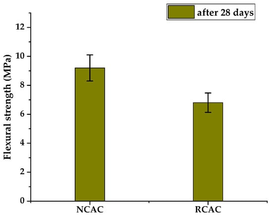 The results indicate that the concrete made of recycled aggregate is characterized by lower compressive strength in each of the curing periods (Figure 4) and 26% lower flexural strength after 28 days (Figure 5). It was also observed that the percentage of compressive strength reduction decreased progressively with time. While the early strength of concrete with recycled concrete aggregate after 7 days was 15% lower in comparison to the concrete with natural aggregate, after 28 days of curing, this difference increased to 20%. The concretes with recycled aggregate were also characterized by greater compressive strength increase after 7–28 days, compared to NCAC.
