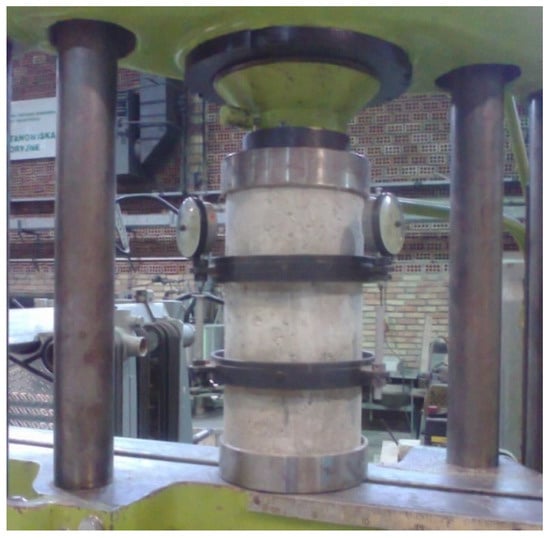 Secant modulus of elasticity was determined in accordance with the PN-EN 12390-13:2014-02 standard [36] on cylindrical samples with the diameter of 150 mm and height of 300 mm. The measurements of dislocations were performed using an extensometer with the base of 100 mm. The modulus of elasticity test was preceded by determining the compressive strength of cylindrical samples, in accordance with PN-EN 12390-3:2019-07 [34], in order to determine the upper limit of compressive force.