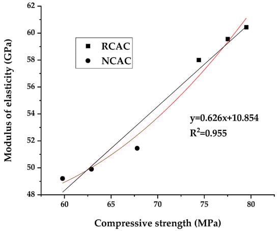 The graph clearly shows close correlation between the modulus of elasticity and the compressive strength of concrete. This is also confirmed by the previous studies conducted by the authors [30]. Similar conclusions were also drawn by Góra et al. [52]. The authors also emphasize the influence of aggregate crushing resistance on the modulus of elasticity of concrete. The concretes containing the aggregate with low crushing resistance had lower moduli of elasticity. Since recycled aggregates are characterized by low crushing resistance [12,13,14,15,16], the concretes produced using these aggregates have lower modulus of elasticity.