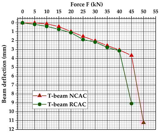 The results of studies indicate that reinforced concrete made of natural aggregate shows smaller deflection compared to the concrete containing recycled aggregate. In case of the applied load of 45 kN, this value is almost 2.5-fold lower than RCAC. The greatest RCAC beam deflection, amounting to 9.08 mm, was noted after applying the load of 45 kN; in turn, the beam with natural aggregate was loaded with 50 kN, achieving the deflection of 11.23 mm. Figure 9 represents a reinforced concrete T-beam during the bending test.