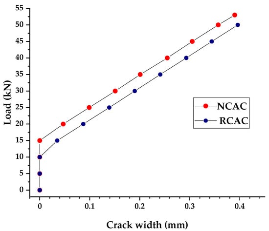 In our testing, despite a lower breaking moment in the concretes with recycled aggregate, all beams were characterized by the same destruction mechanism. Figure 10 presents the dependence of the applied load on the crack width in the investigated beams.